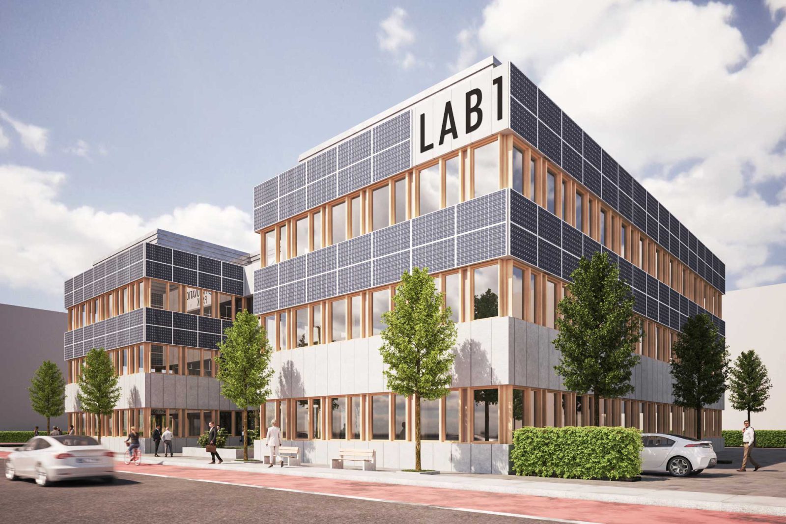 Mit Photovoltaik-Modulen am Gebäude kommt weitere regenerative Haustechnik zum Einsatz. Darüber hinaus wird eine Solar-Carportanlage in Modulbauweise errichtet, deren selbstproduzierter Strom sowohl zum Aufladen von Elektrofahrzeugen als auch für die Stromversorgung des Gebäudes genutzt werden kann. Für ein verbessertes Mikroklima werden die Dachflächen von LAB 1 möglichst umfangreich begrünt. Ein ressourcenschonendes Regenrückhaltesystem auf dem Dach wird zur Entlastung der Abwassersysteme und zur passiven Kühlung des Gebäudes beitragen.