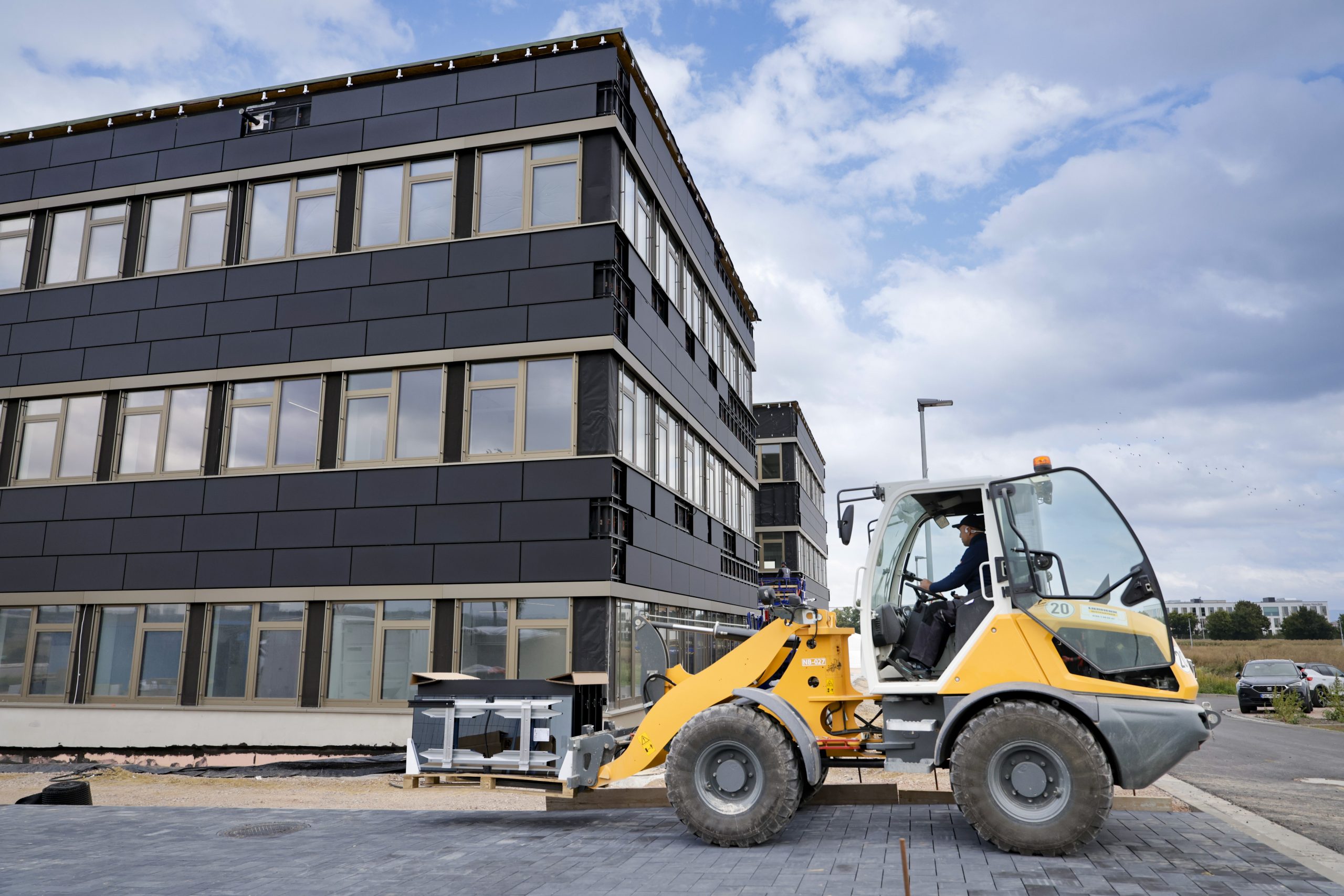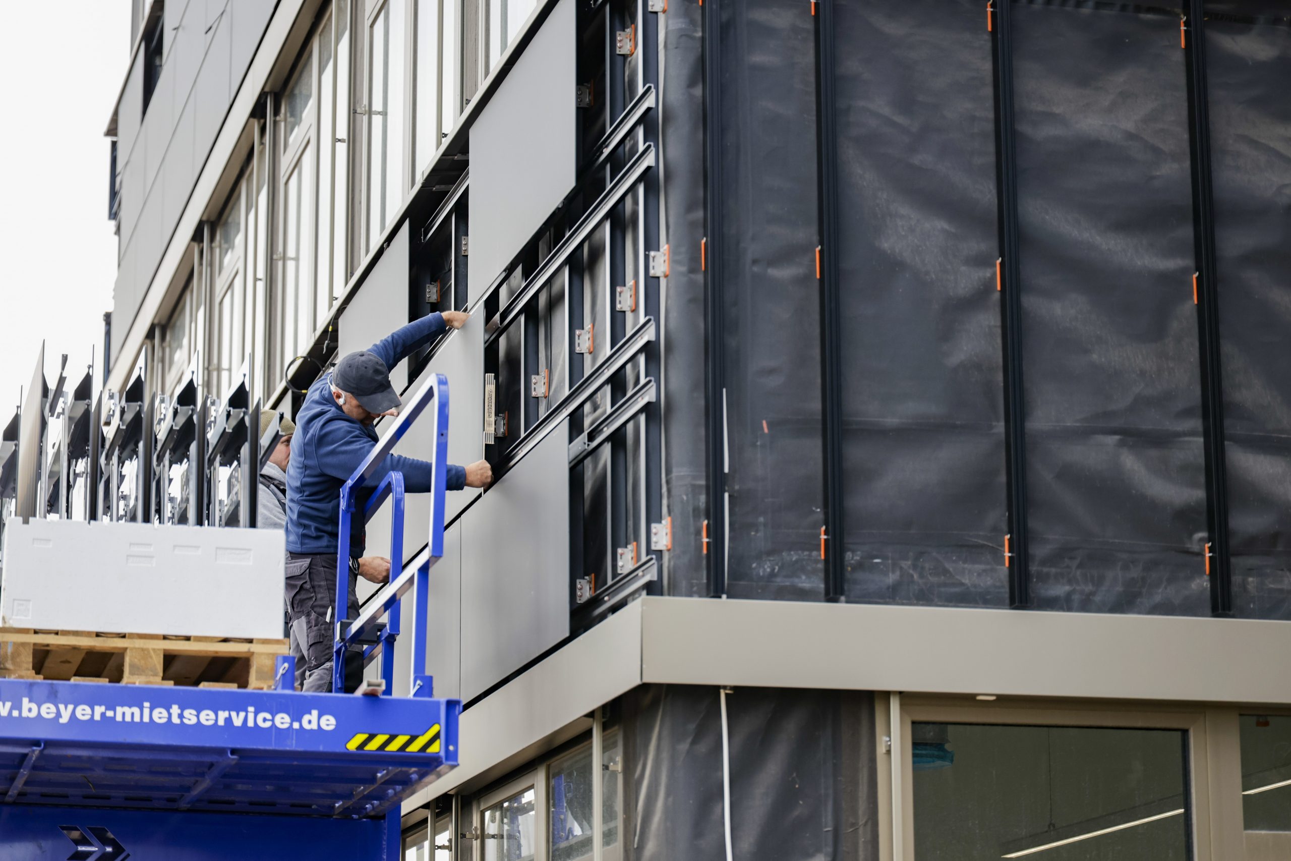 Auftakt-Laborgebäude mit innovativer Fassade: In direkter Nachbarschaft zur Universität Mainz entsteht in den kommenden Jahren ein hochmoderner Biotechnologie-Campus. Den Auftakt macht das Labor- und Bürogebäude LAB 1, das von der Bauunternehmung Gemünden errichtet wird. Nicht nur als erstes Gebäude, sondern auch ökologisch geht das Gebäude voran. So setzt etwa die innovative Fassade Maßstäbe, die aktuell mit Photovoltaik-Dünnschichtmodulen versehen wird. Die Fassade ist so konzipiert, dass auf allen möglichen Flächen rund um das Gebäude über Fassaden-PV Strom erzeugt werden kann. Besonders vorteilhaft für eine stromintensive Labor-Arbeitswelt: So können die solaren Gewinne optimiert werden. Die Fläche der PV-Paneele umfasst beim LAB 1 ca. 1.800 m². Die Spitzenleistung der PV liegt bei 100 KWpeak. Es ist von ca. 85.000 KWh an Stromproduktion pro Jahr durch die Fassade auszugehen. Weitere nachhaltige Komponenten des LAB 1 sind unter anderem die Holzhybridbauweise, die CO2 speichernde Holzfaserdämmung, der fast vollständige Einsatz von Recyclingbeton bei den Betonarbeiten, die Energieversorgung mit Heizen und passivem Kühlen über Geothermie sowie die Ladeinfrastruktur für E-Mobilität. Das LAB 1 ist Teil der InnovationLabz-Laborgebäude, die auf dem Campus von den regionalen Investoren J. Molitor Immobilien GmbH und G. L. Kayser Immobilien GmbH entwickelt werden. Für die architektonische Gestaltung zeichnet das Büro Ries + Ries Architekten und Ingenieure verantwortlich.