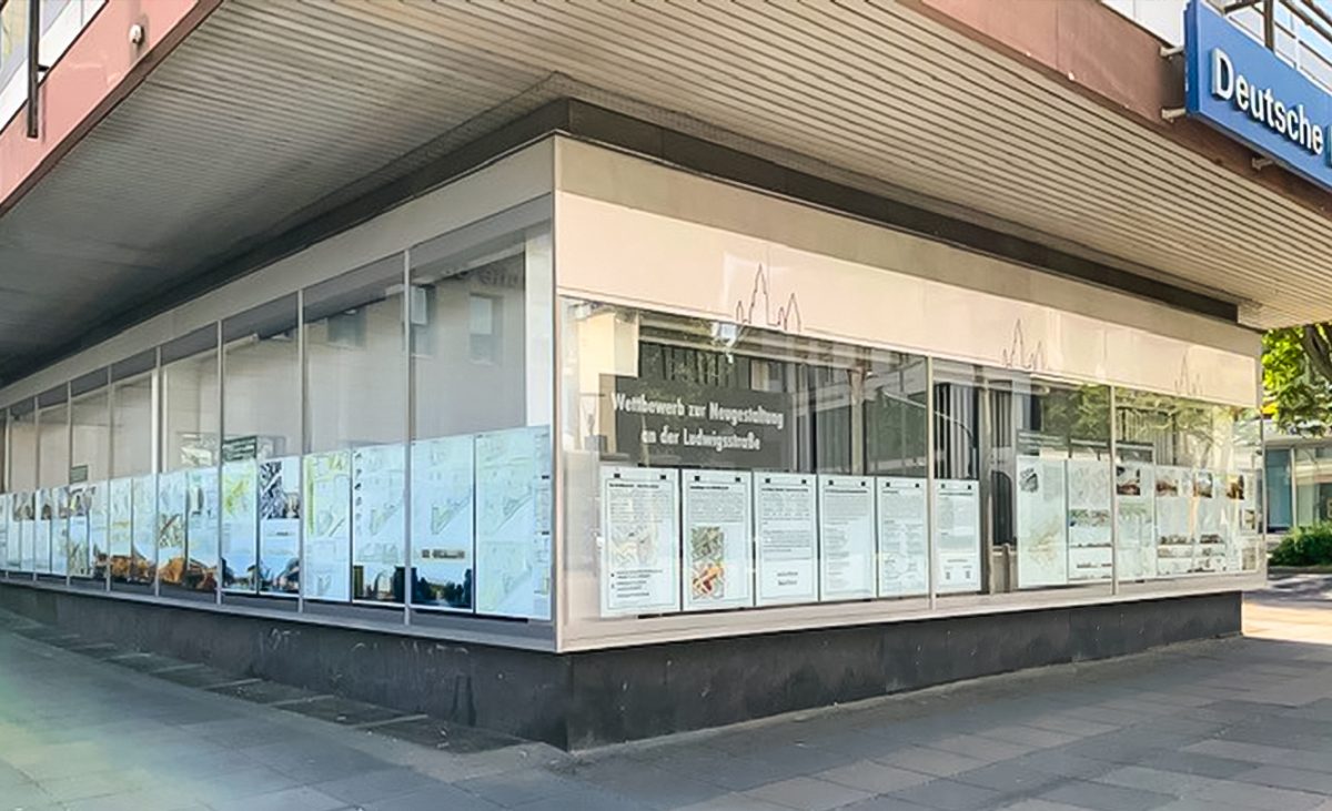 Der Wettbewerb hatte eine spannende Bandbreite an Entwürfen hervorgebracht. Hier können Sie sich umfassend informieren: Sämtliche Wettbewerbsergebnisse finden Sie online unter www.lu-erleben.de. Oder schauen Sie sich die Entwürfe doch einfach im Großformat bei einem Spaziergang direkt am Ort des Geschehens an. In den Schaufenstern des Deutsche Bank-Pavillons an der Mainzer Ludwigsstraße sind ab sofort alle Wettbewerbsergebnisse ausgestellt – sozusagen als „Rund um die Uhr“-Ausstellung bis zum 1. Juni 2020. So haben Sie vor Ort einen Eindruck von den Entwürfen und können im direkten Vergleich mit dem Ist-Zustand einen Blick in die Zukunft werfen.