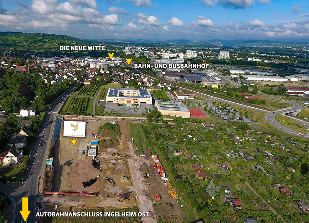Im grünen Umfeld und doch mitten in der Stadt: So lebt es sich im neuen Premium-Wohngebiet „Am Gänsberg“. Nur wenige Gehminuten von der Neuen Mitte entfernt, bietet Ihnen diese wunderbare Wohnlage alle erdenklichen Annehmlichkeiten. Nahversorgung, Shopping-Bummel, Arztbesuche – alle Dinge des täglichen Lebens erledigen Sie vom Gänsberg aus im Handumdrehen. Kindergarten und Schulen sind bequem fußläufig erreichbar. Und auch die Freizeit beginnt quasi vor der Haustür: Nur ein kleiner Spaziergang ist es bis zum Kaffee trinken, schön Essen gehen, zum Kino oder zur Kultur in der kING-Halle. Ein weiterer Pluspunkt ist die Verkehrsanbindung: Mit dem nahegelegenen Bahnhof und Busbahnhof sowie dem nur fünf Minuten entfernten Autobahnanschluss Ingelheim-Ost erreichen Sie alle Ziele im Rhein-Main-Gebiet schnell und unkompliziert.