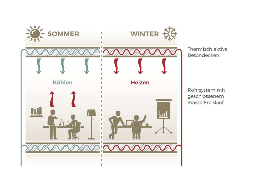 Die funktioniert im Prinzip wie eine Fußbodenheizung. Durch die Decken laufen Rohrleitungen, durch die im Sommer kaltes und im Winter warmes Wasser fließt. Die Decken werden auf diese Weise thermisch aktiviert und dienen als Heiz- oder Kühlkörper.