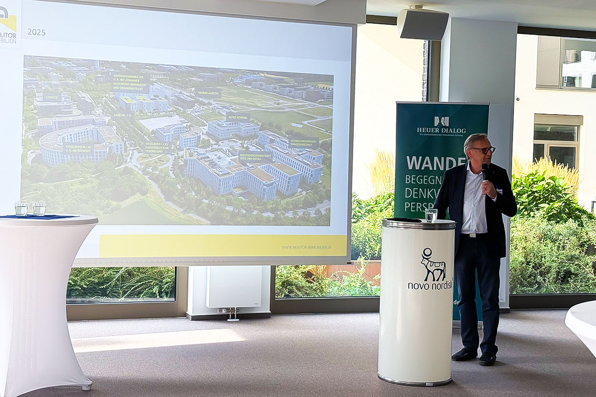Der Auftaktabend des renommierten Branchenevents „Immobiliendialog Mainz-Wiesbaden“ warf ein Spotlight auf die dynamischen Entwicklungen am Mainzer Stadteingang: Molitor-Geschäftsführer F.A. Graf von Pfeil zeichnete in einem Impulsvortrag die Erfolgsgeschichte des Büroparks Kisselberg nach. Molitor-Geschäftsführerin Tina Badrot beleuchtete gemeinsam mit weiteren Experten aus Politik, Wirtschaft und Forschung infrastrukturelle Erfolgsfaktoren für Biotechnologie-Standorte. Bei einem Rundgang auf dem künftigen Biotech-Areal gab Molitor-Projektleiter Christian Veith erste Einblicke in das neue Labor- und Bürogebäude LAB 1 und führte über die Baustelle für das LAB 2. Beim anschließenden Austausch bei Wein und Imbiss zeigte sich: Die Entwicklung am Mainzer Stadteingang begeistert.