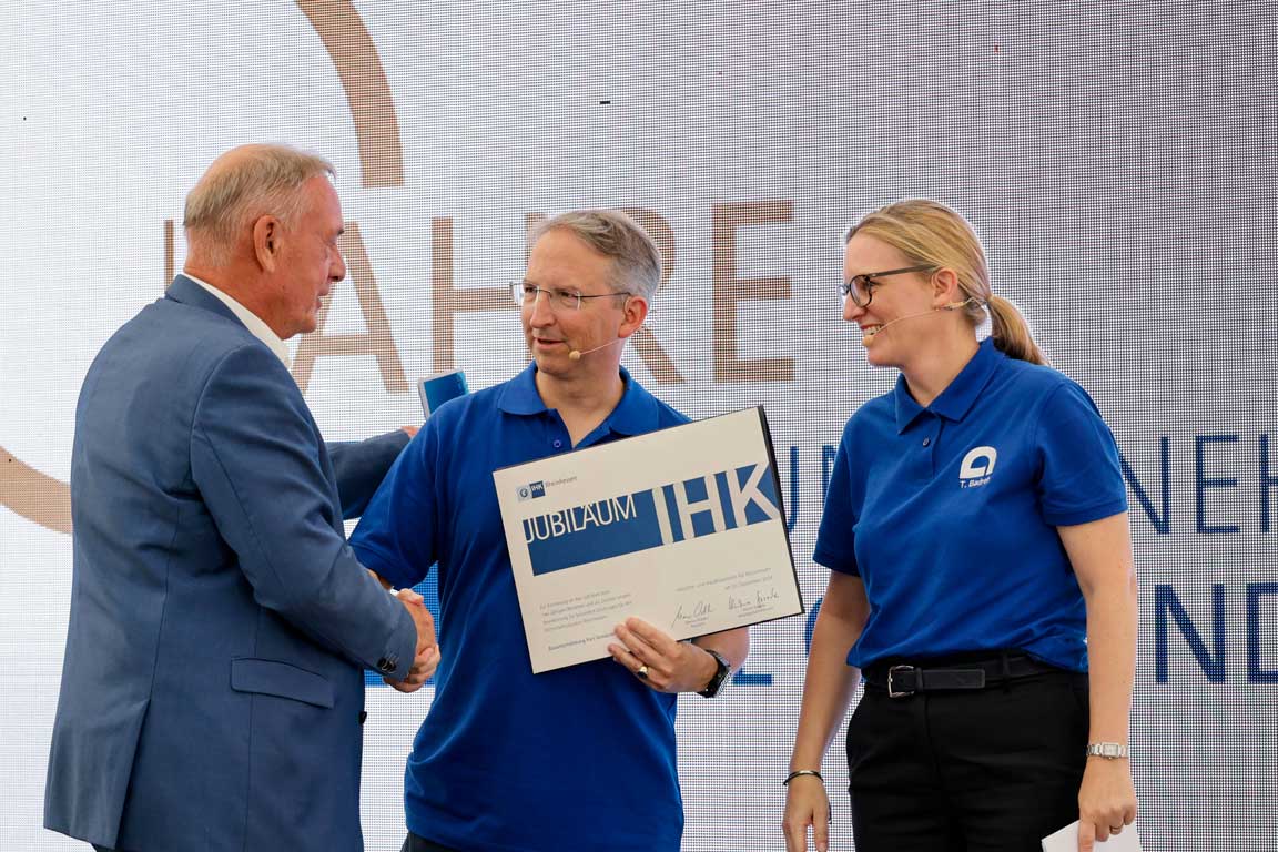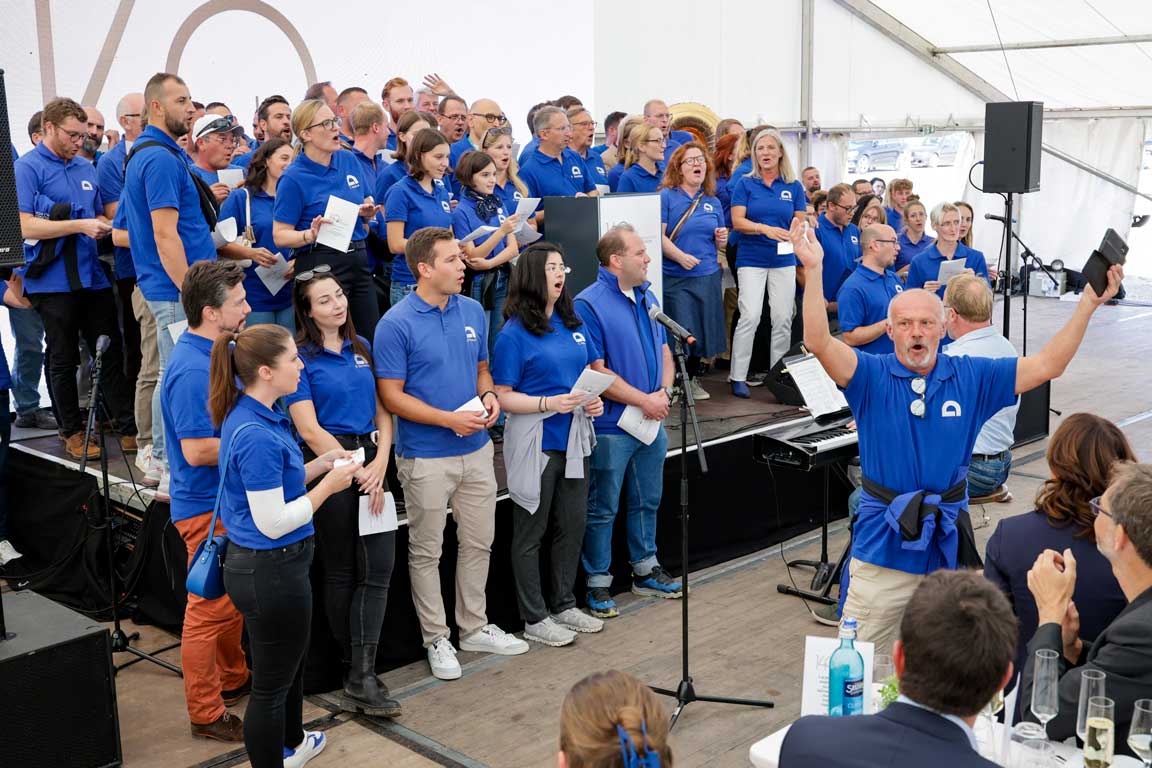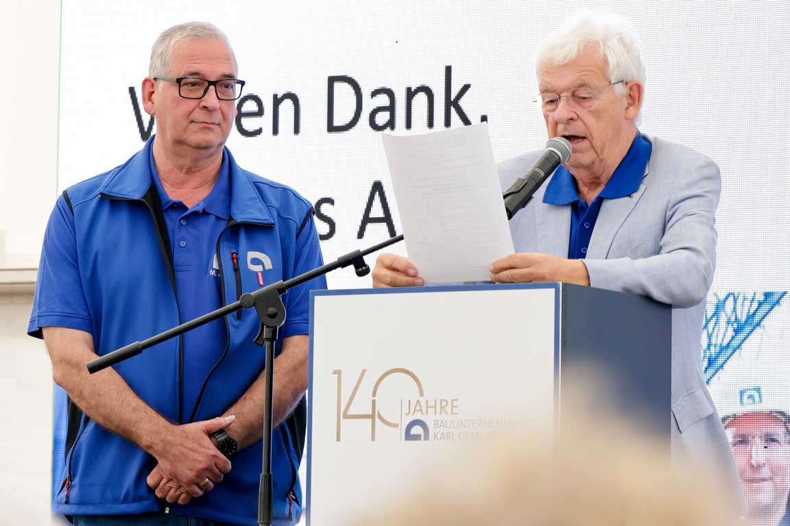 Ein besonders emotionaler Moment war die Verabschiedung des langjährigen Gemünden-Geschäftsführers Markus Allendorf, der nach 37 Jahren Firmenzugehörigkeit seinen wohlverdienten Ruhestand antritt. Der inzwischen legendäre Gemünden-Chor besang mit „Oh Karl, is des schee“ auf die Melodie von „Oh, Champs-Élysées“ das Gemünden-Logo. Im Anschluss an den offiziellen Festakt stieg ein großes Fest mit Grillbuffet, Musik und Kinderprogramm für die Familien unserer Mitarbeiterinnen und Mitarbeiter.