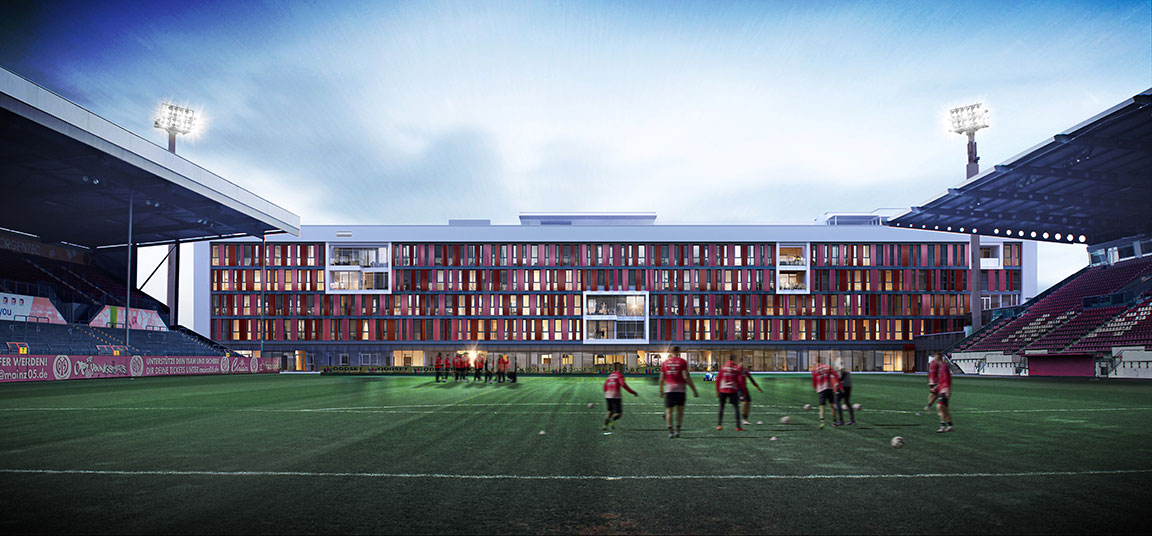 Gemeinsam mit dem Fußballbundesligisten Mainz 05 entwickelt die J. Molitor Immobilien GmbH ein innovatives Multifunktionsgebäude am traditionsreichen Bruchwegstadion. Auf dem neuen Wolfgang-Frank-Campus entstehen rund 11.100 m². Ein Großteil dieser attraktiven Gewerbeflächen werden unter anderem die Geschäftsstelle, das Nachwuchsleistungszentrum und den Profibereich von Mainz 05 beherbergen. Ca. 2.900 m² hochmoderne, frei anmietbare Büro- und Praxisflächen stehen noch zur Verfügung. Die nachhaltig konzipierten GROW-Arbeitswelten bieten flexible Raumkonzepte, die sich individuell an Ihre Bedürfnisse anpassen lassen. Anmietbare Konferenzbereiche sorgen für zusätzliche Flexibilität und machen den Campus zu einem vielseitigen Arbeits- und Begegnungsort.