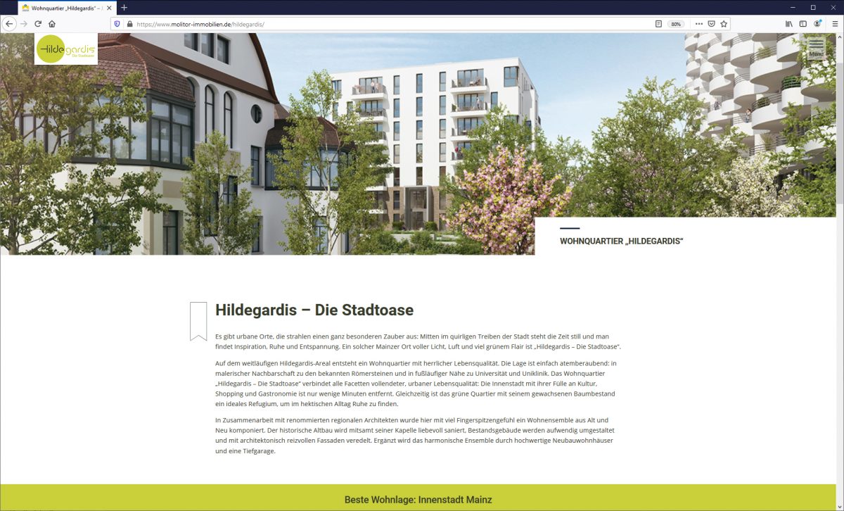 Über das neue Wohnquartier „Hildegardis – Die Stadtoase“ gibt es viel zu erzählen. Um Sie schon vor Vertriebsstart immer up-to-date zu halten, haben wir zwei Kanäle vorbereitet, auf denen wir Sie immer wieder mit neuen Infos, Geschichten und spannenden Bildern überraschen werden. Per Instagram und über den Blog auf der Projektwebseite nehmen wir Sie mit auf Entdeckungsreise in die entstehende grüne Oase in urbaner Nachbarschaft. So erfahren Sie alles rund um das neue, einzigartige Mainzer Wohnquartier. Die Bildergalerie auf der Webseite gibt Ihnen zusätzlich einen luftigen Ausblick über das wunderschöne und geschichtsträchtige Areal mitten in Mainz. Ob Käufer, Mieter oder neugierige Mainzer – Wir freuen uns auf Ihren Besuch!