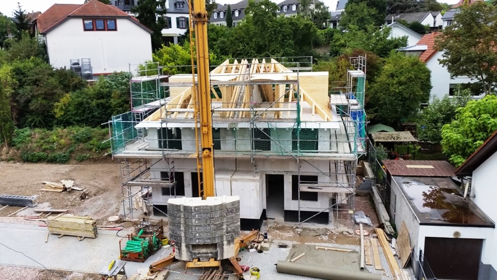 Die nostalgischen Luisenhäuser in Bodenheim nehmen Gestalt an. Rohbau und Dachkonstruktion stehen und vermitteln einen ersten Eindruck von dem besonderen Stil der Doppelhaushälften. Schauen Sie selbst auf unserer Webcam.